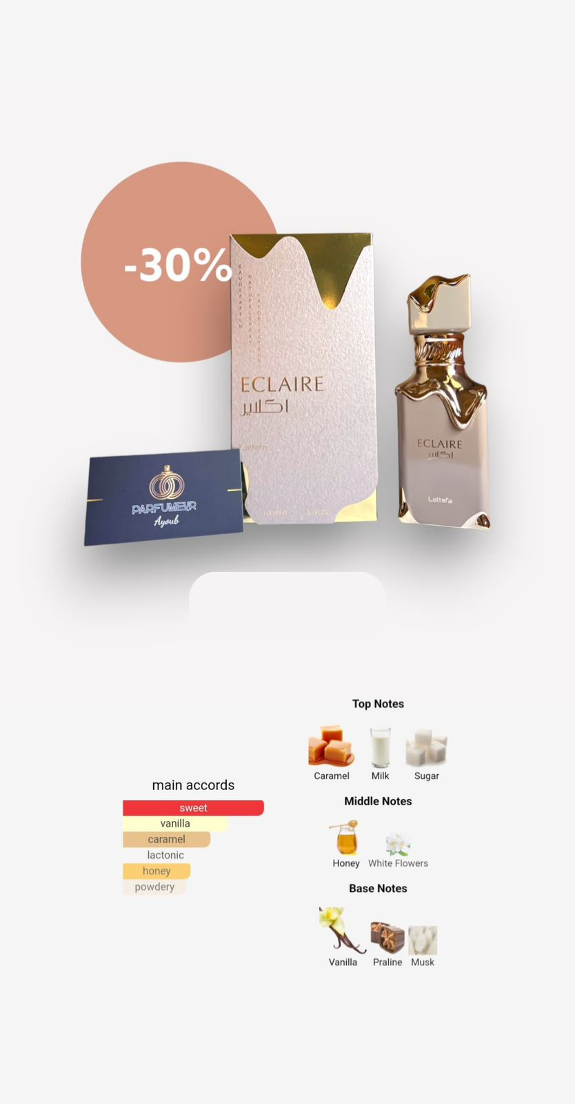 Découvrez le charme d’Eclaire Lattafa, un parfum sophistiqué qui séduit les sens avec un succulent mélange de caramel, de lait et de sucre en tête, enveloppé par le parfum délicat de fleurs blanches et de miel en son cœur.