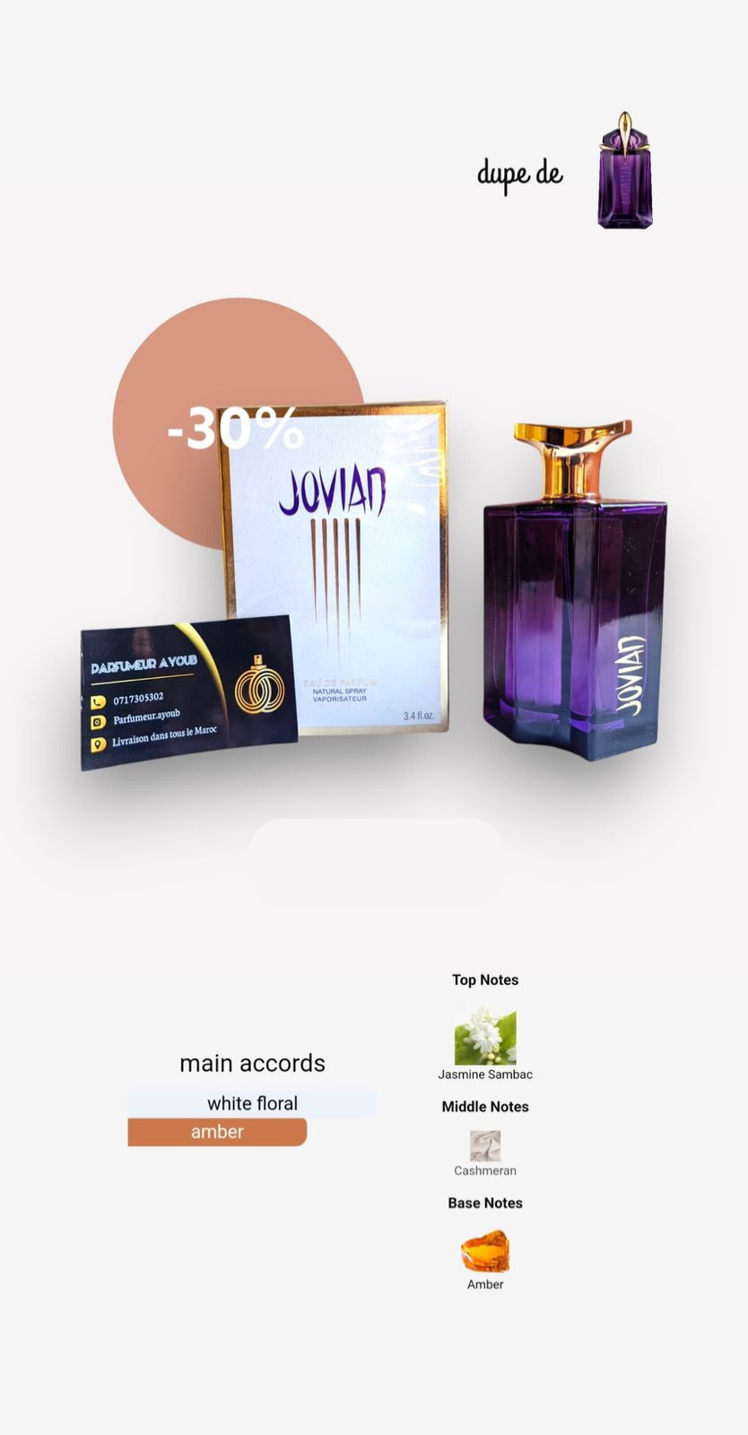 Jovian de Fragrance World est un parfum de la famille olfactive boisée florale pour femme. Notes de tête : essence de mandarine ; Notes de cœur : jasmin du Maroc ; Notes de fond : ambre blanc et bois de cachemire. Enveloppé d’un voile de mystère et d’élégance, le parfum Jovian séduit par son essence enivrante. Dès la première rencontre, la mandarine éveille la curiosité avec sa fraîcheur hespéridée, tandis que le jasmin du Maroc révèle des couches de sensualité florale. L’ambre blanc, chaleureux et enveloppant, crée un sillage irrésistible qui laisse une trace indélébile dans la mémoire olfactive. Tel un câlin de soie, le bois de cachemire apporte une subtile profondeur, complétant chaque facette de ce parfum qui invite au désir et au plaisir à chaque respiration !!!