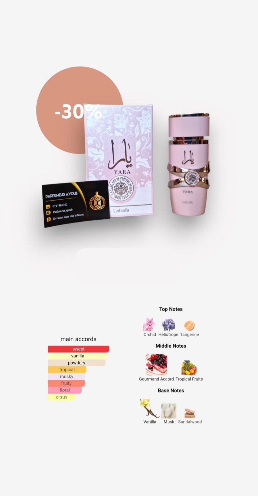 Lattafa Yara est un parfum doux, doux et féminin centré sur la vanille et les orchidées. La note de tête s’ouvre de manière vive, fruitée et florale sur la mandarine, l’héliotrope et l’orchidée. Des notes tropicales et gourmandes remplissent le cœur, suivies d’une base veloutée de vanille, de bois de santal et de musc.